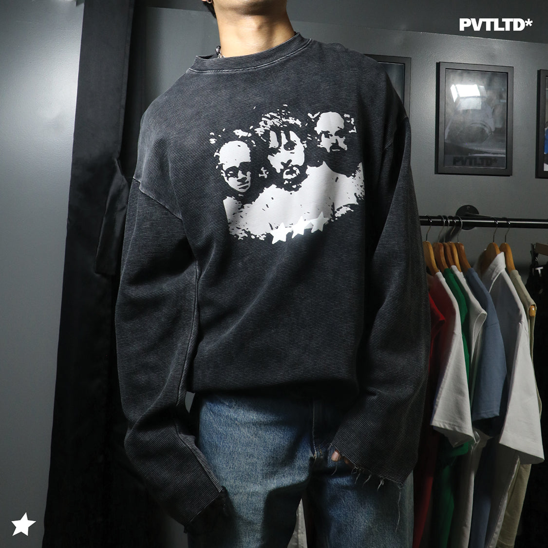 This full sleeve is made with one of a kind ribbed fabric with raw edge sleeves which give a raw finish to the garment. It has been acid washed to perfection. The design speaks about cinema as an art form taking inspiration from the Indian film ‘Delhi Belly’. The model is wearing a L for an oversized look. You can go for smaller sizes.